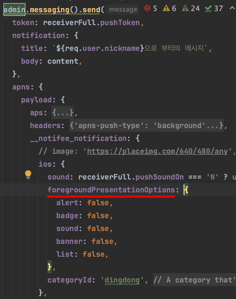 ios 는 foreground 인데도 노티가 보여졌다. foreground 에서 기본적으로 안보여지게 하려면 서버측에서 foregroundPresentationOptions 값들을 false 로 주어야 한다.