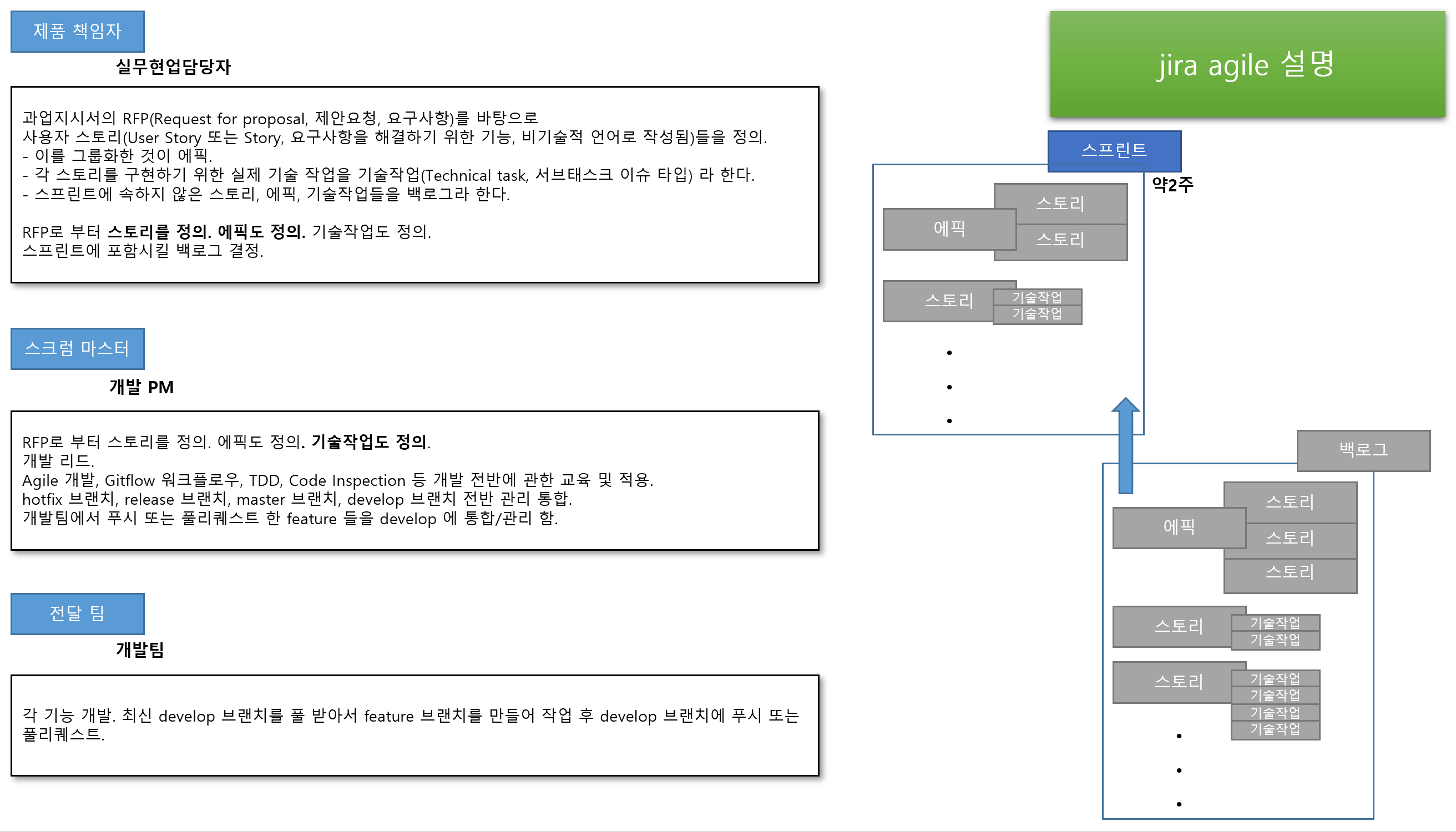 - 이슈와 이슈타입: 스토리, 에픽 같은 모든 작업 단위는 이슈이다.